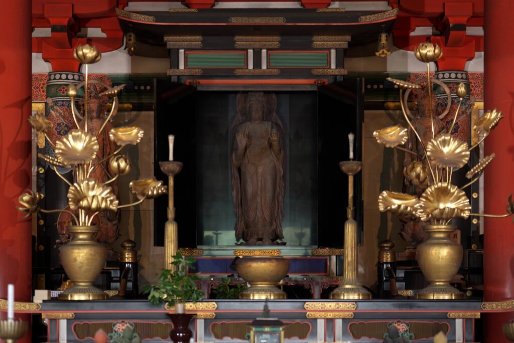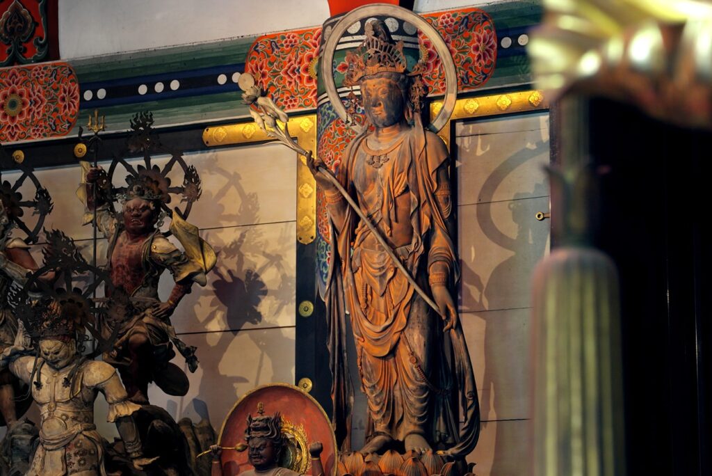 神護寺本尊・薬師如来立像の両脇に立つ日光菩薩立像・月光菩薩立像は、本尊とともに9世紀の作と考えられます。