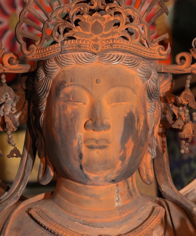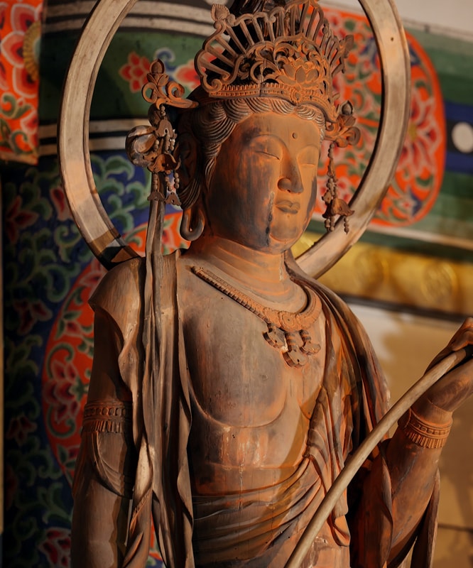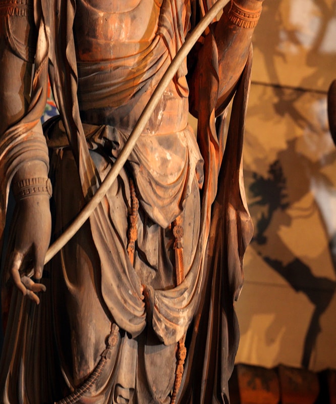 いずれも、もとは一木造ですが、日光菩薩は腰から下、月光菩薩は膝から下に当初の部分が残り、それ以外は後の時代に補われたものです。