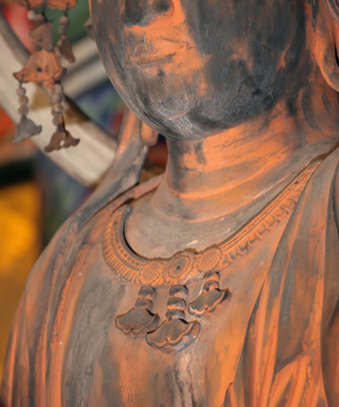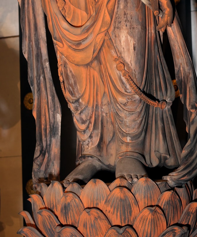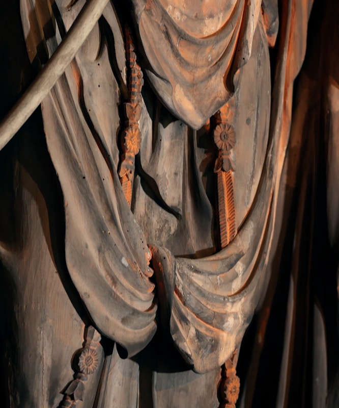 下半身にはやわらかく穏やかな彫りが施され、表面もなめらかで、本尊の引き締まった表現とは好対照をなしています。