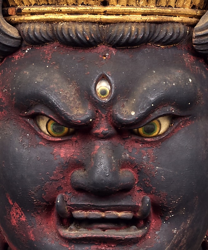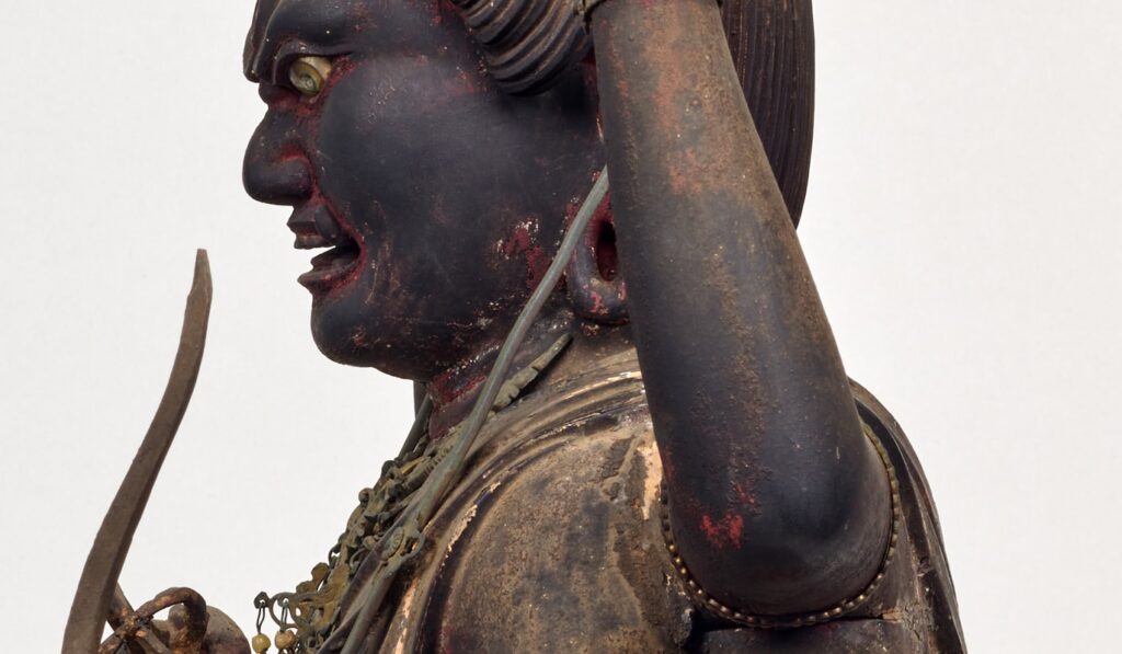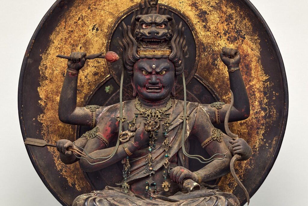 愛染明王は、愛欲や執着といった煩悩を悟りへと導く密教の尊格で、怒りの表情、獅子冠、額の第3の眼、6本の腕をもつ姿が特徴です。