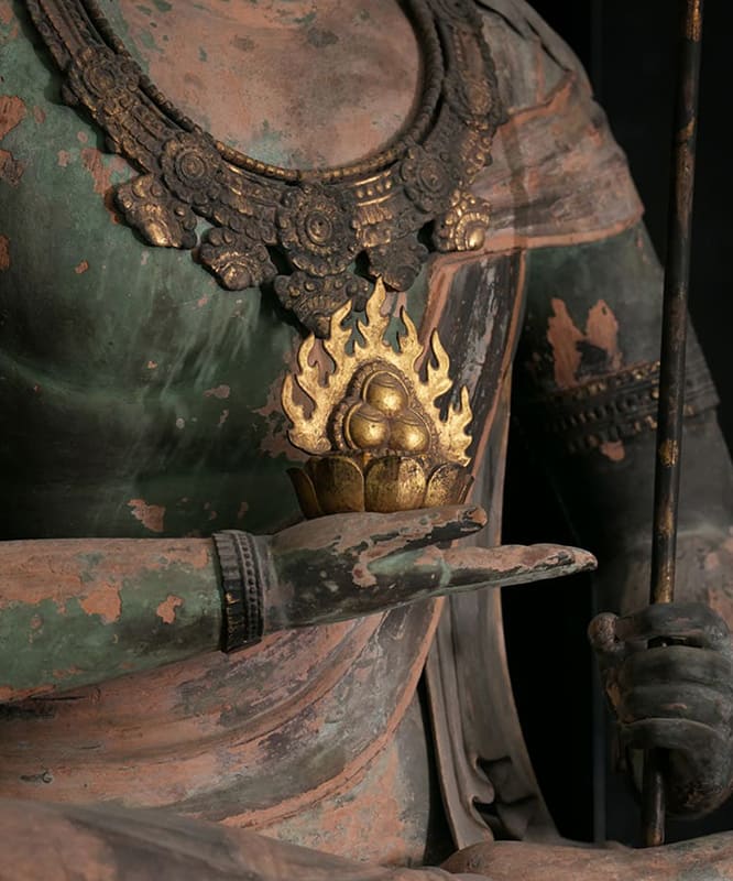 Jede Statue wurde mit Ausnahme der Arme aus einem einzigen Holzblock geschnitzt und mit Kokusō-Lack vollendet. Die Farben der Statuen stammen aus einer Neubemalung Ende des 9. Jh. Einige der Juwelenkronen, Ornamente, Sockel und Heiligenscheine verschwanden oder wurden ersetzt, doch sie bleiben gefeierte Meisterwerke der esoterischen buddhistischen Bildhauerei.