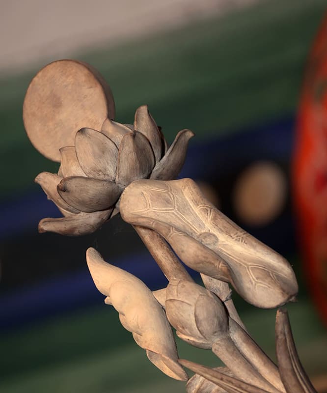 Nikkō und Gakkō stehen auf Lotusthronen, tragen Juwelenkronen und himmlische Gewänder und halten lange Lotusstängel. Auf den Lotusstängeln hält Nikkō die Sonne und Gakkō den Mond.