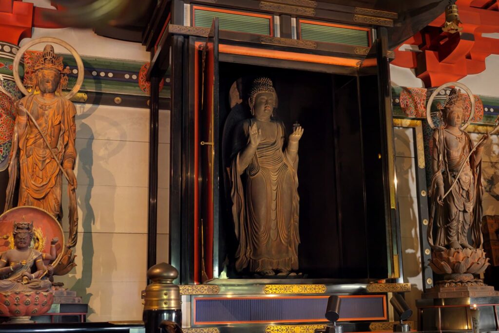 Die Begleitstatuen der Bodhisattvas Nikkō (Suryaprabha) und Gakkō (Candraprabha) flankieren das Hauptbild des Buddha Yakushi (Bhaisajyaguru) im Jingoji-Tempel. Alle drei Statuen sollen im 9. Jahrhundert entstanden sein.