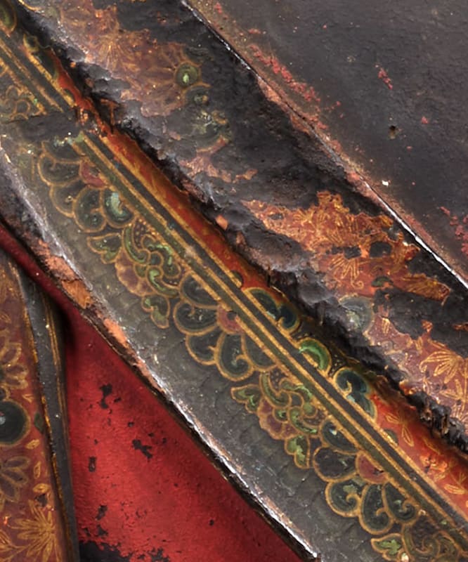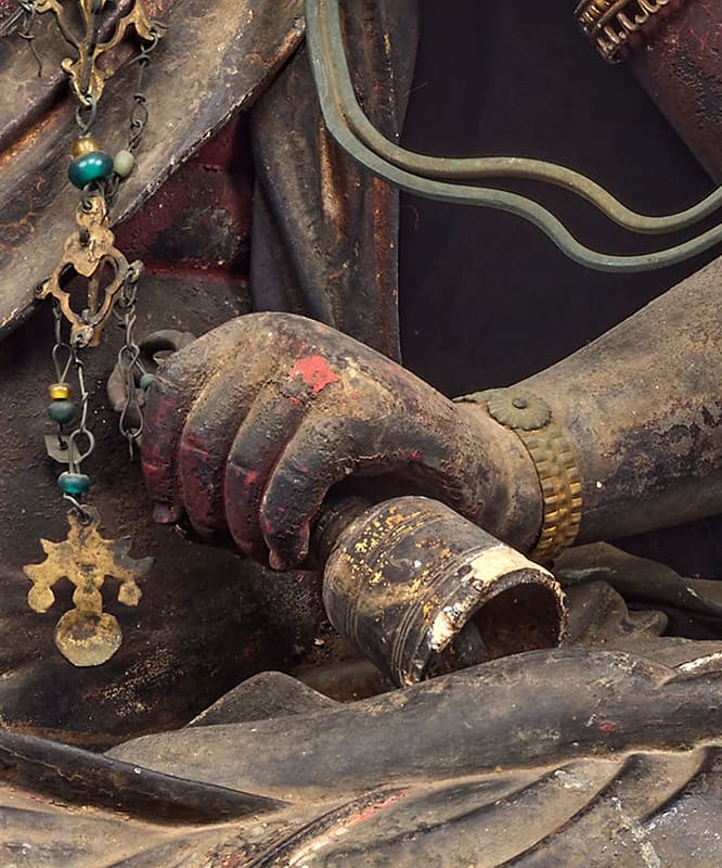 Heute ist die Statue überwiegend schwarz, doch ursprünglich vollständig mit rotem Pigment bedeckt. Die ursprünglichen Verzierungen auf Brust und Armen sind noch vorhanden und überall zeigt sich eine feine Verarbeitung. Der lebhafte Gesichtsausdruck der Statue, ihre lebensechte Form und die sanft welligen Falten des Gewandes um die Taille verleihen der Statue Dynamik.