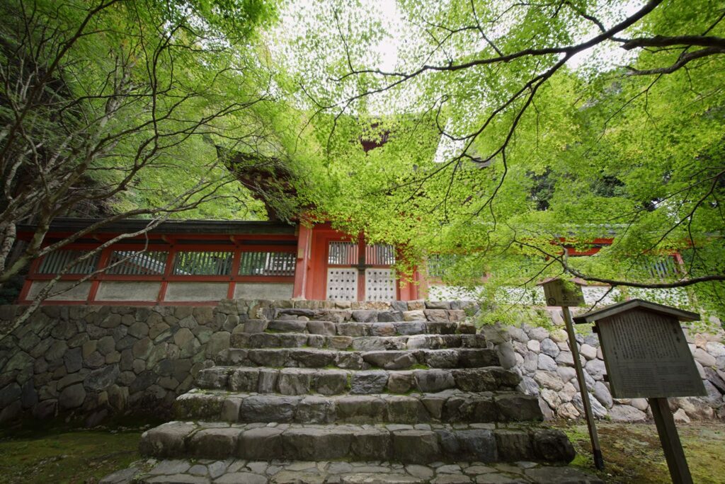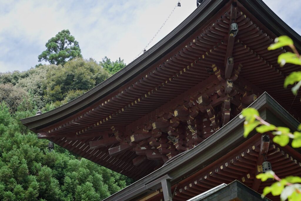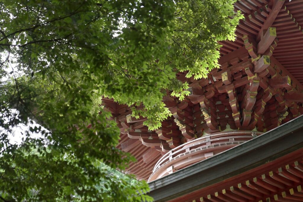 Diese zweistöckige Pagode steht auf einem Hügel hinter der Kondō-Halle, ruhig eingebettet zwischen Kirsch- und Ahornbäumen. Sie wurde während eines groß angelegten Wiederaufbaus des Tempels in der frühen Shōwa-Ära (1926–1989) errichtet. Bei Ausgrabungen im Zuge des Wiederaufbaus fanden sich die Überreste einer älteren Pagode, demzufolge hier bereits vor Jahrhunderten eine Pagode stand.