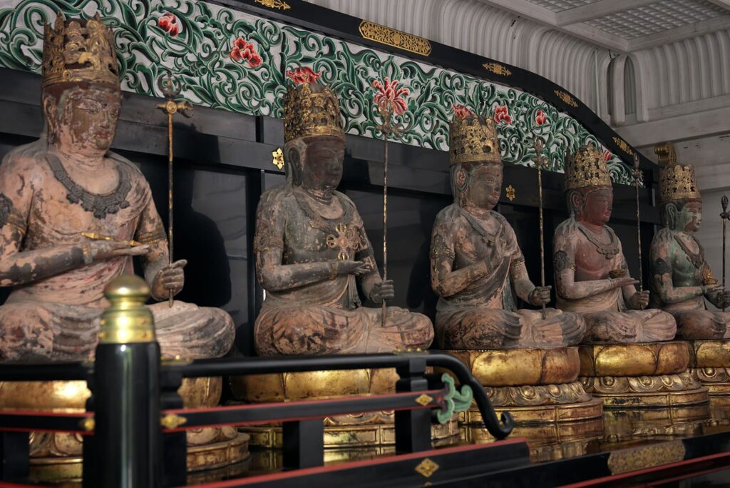 Die einzigartige Struktur der Pagode, eine quadratische untere, und eine runde obere Ebene, ist typisch für Shingon-Tempel. Sie hat ein Pyramidendach mit Kupferziegeln und eine exquisit gearbeitete Kassettendecke mit kleinen dekorativen Tafeln. Innen sind die Statuen der Fünf Großen Manifestationen des Bodhisattva Kokūzō (Akasagarbha), die insgesamt als Nationalschatz gelten, in einer Reihe an der Rückwand aufgestellt.