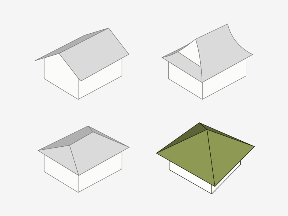 Eine Dachkonstruktion mit vier gleichmäßig geneigten Seiten und oben in einem Punkt zusammenlaufenden Dachfirsten, wodurch eine Pyramidenform entsteht. Dieser traditionelle Dachstil wird bei Tempelbauten wie buddhistischen Hallen, Sutra-Archiven und dem Obergeschoss von Pagoden verwendet.