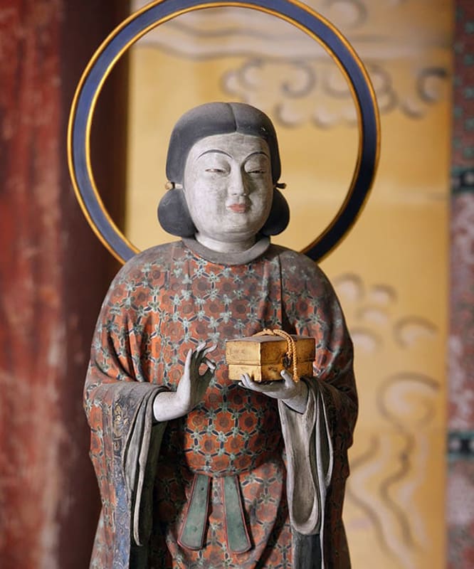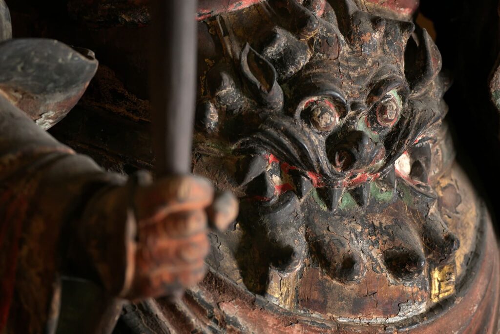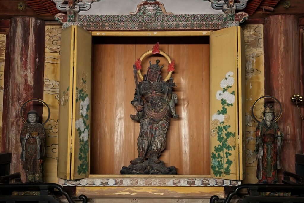 据推测,这尊武神毗沙门天的雕像是平安时代(794-1185)后期制作的,是毗沙门堂的本尊。根据传统,毗沙门天被描绘成脚踩恶魔,身穿金箔铠甲的形象。他一手握着镶有宝石的权杖,另一手托着宝塔。头盔的装饰不同寻常,饰有恶鬼的面容,顶端嵌有一颗宝珠。