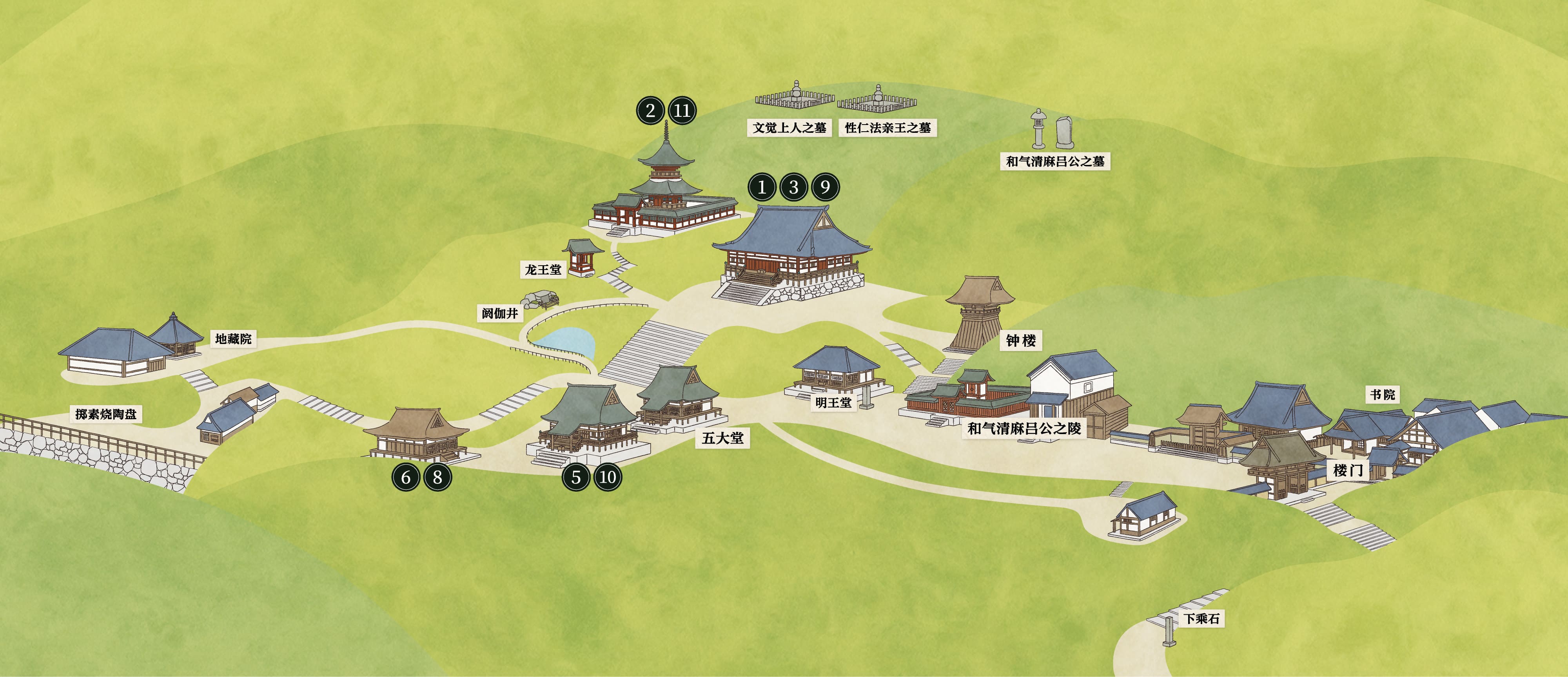 境内图 步入神护寺的世界 寺院地图可以缩放。 ① 药师如来立像 ② 五大虚空藏菩萨坐像 ③ 日光菩萨和月光菩萨立像 ④ 干漆药师如来坐像 ⑤ 毗沙门天立像 ⑥ 板雕弘法大师像 ⑦ 爱染明王坐像 ⑧ 大师堂 ⑨ 金堂 ⑩ 毗沙门堂 ⑪ 多宝塔 了解文化遗产 收听语音导览 观看视频导览 体验虚拟现实 浏览寺院地图